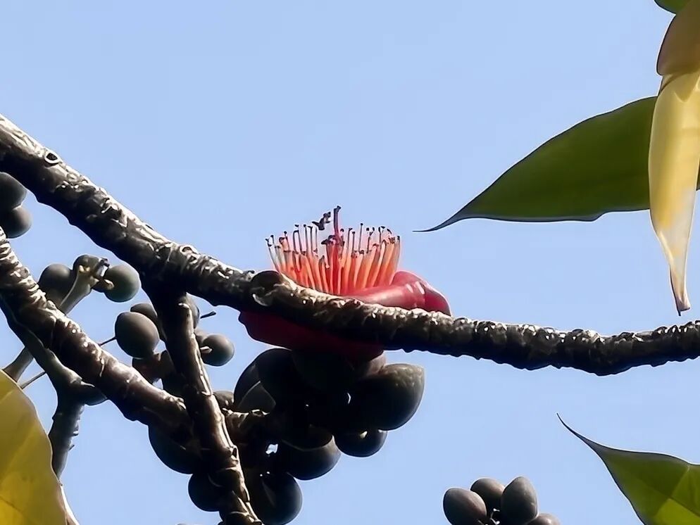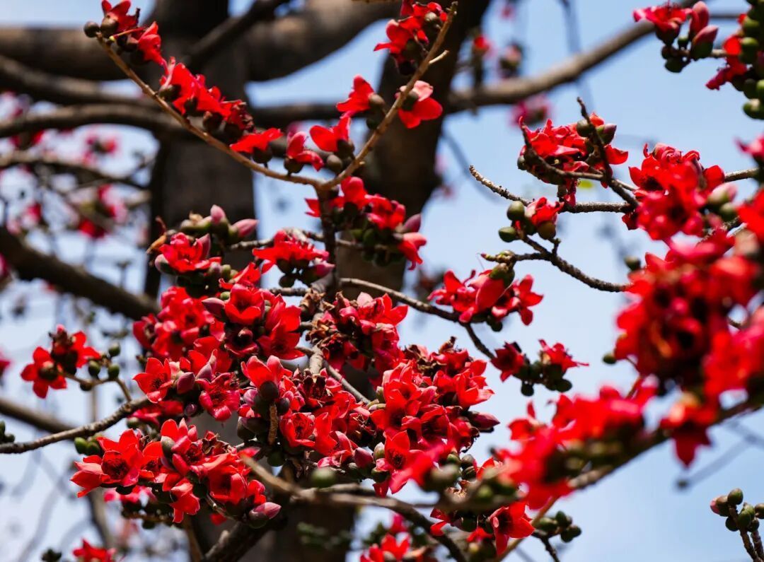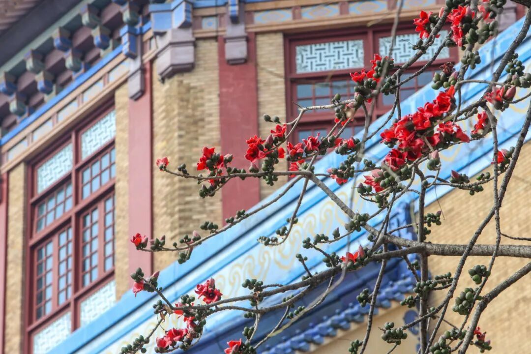 现场可见,“木棉王”枝干上的两朵红花,与纪念堂蓝瓦黄墙相映成趣,构成“红棉映华堂”的早春盛景。